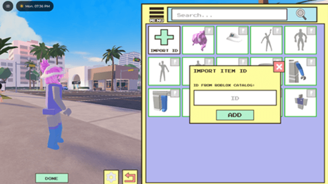 - Type or paste one of the working Item IDs (codes) into the "ID" field and hit "Add". The item should instantly equip to your avatar!
